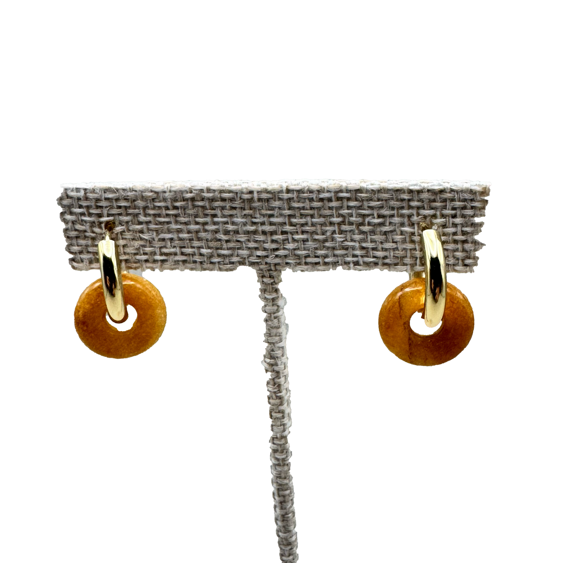 Aretes con aro dorado y detalle circular en tono ámbar.