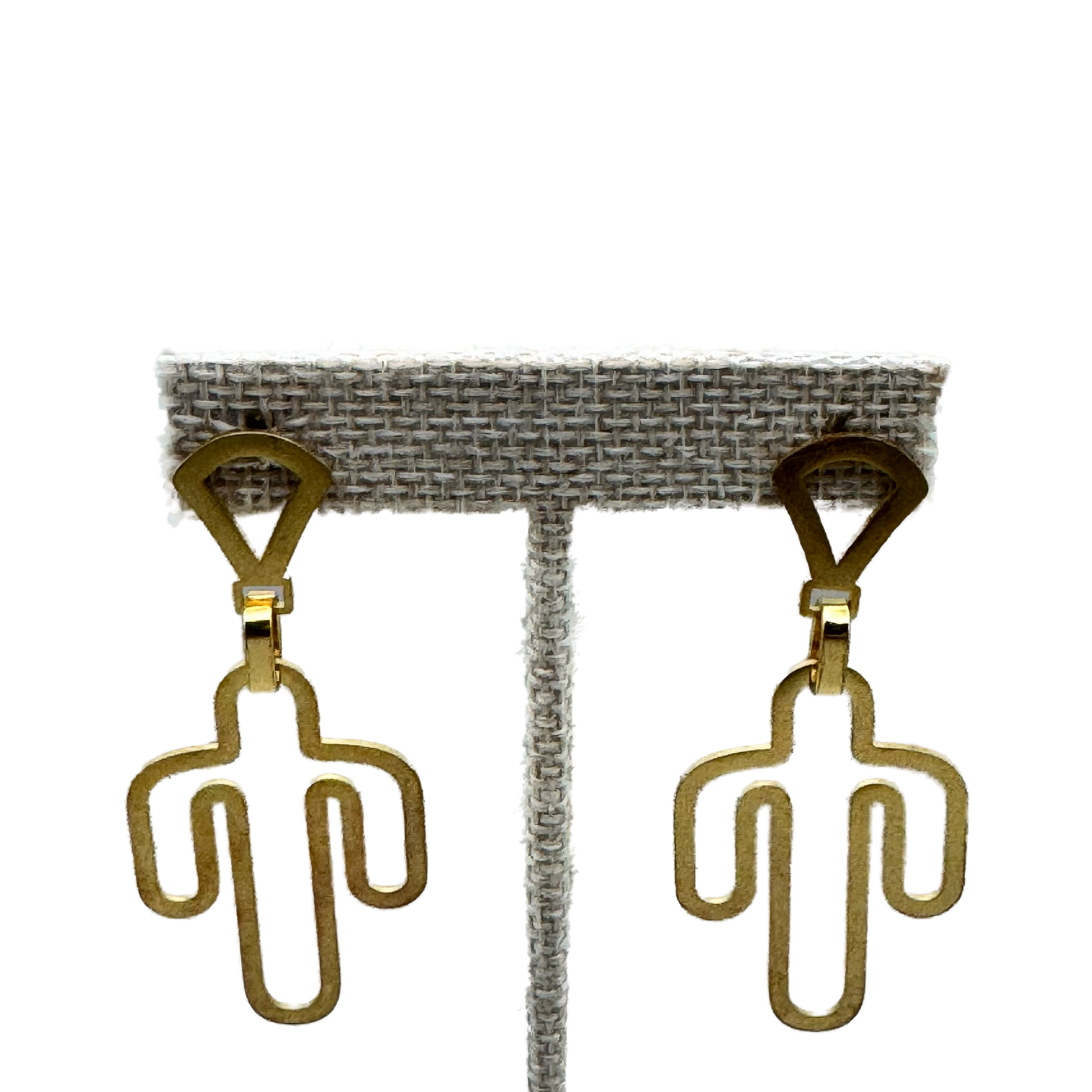 Aretes en tono dorado con diseño abstracto inspirado en la silueta de un cactus invertido.
