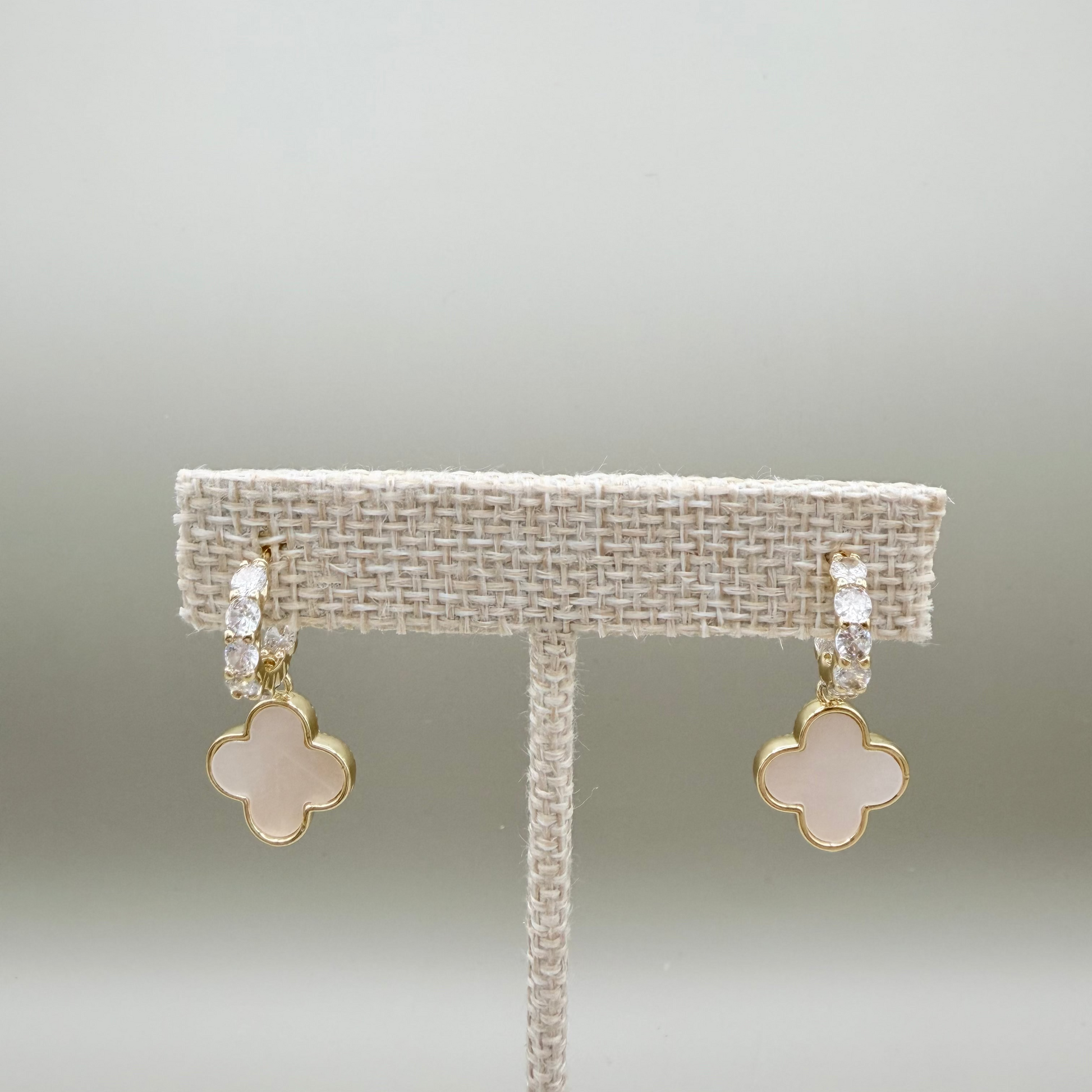 Aretes tipo VC trébol con madreperla y cristales.