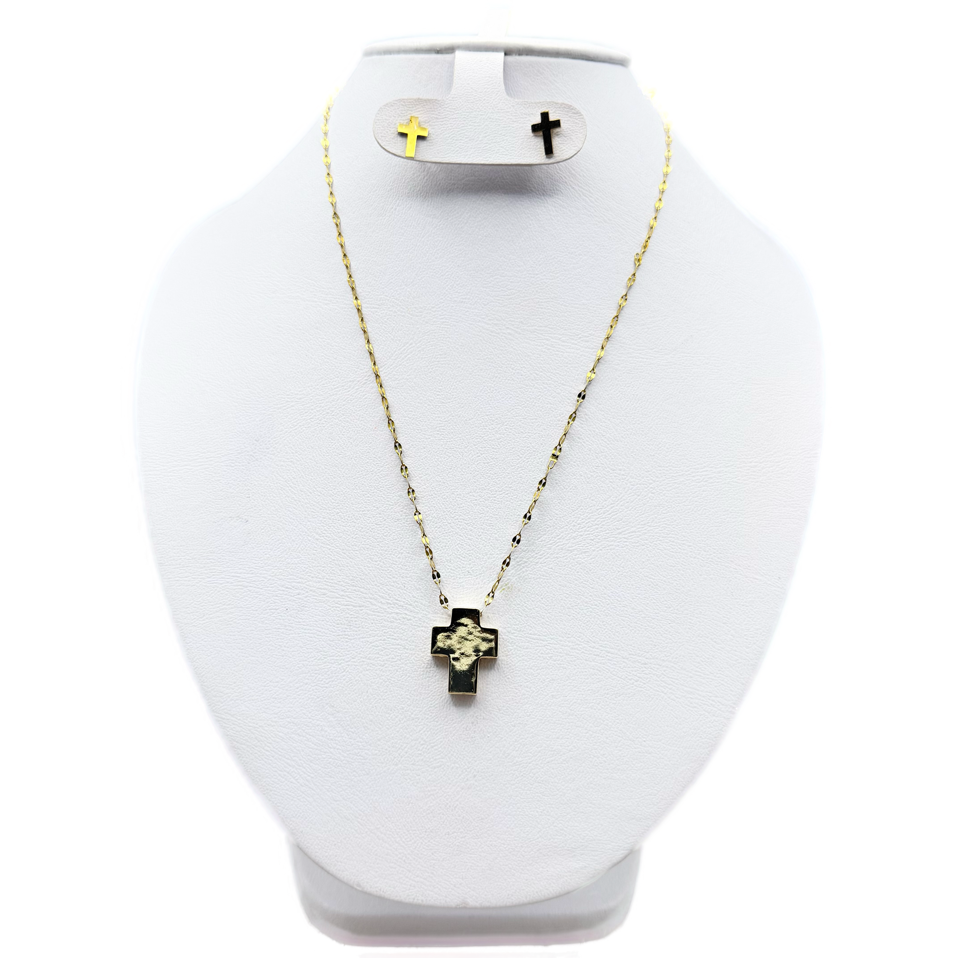 Conjunto de collar y aretes con diseño de cruz minimalista, elaborado en acero inoxidable con elegante color dorado. El collar presenta un dije de cruz con acabado moderno que aporta un estilo sobrio y versátil, ideal para uso diario o para complementar atuendos formales.
