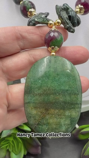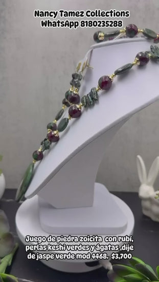 Juego de piedra zoicita con rubí, perlas keshi verdes y ágatas dije de jaspe verde