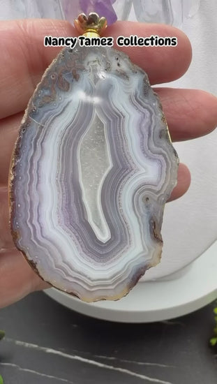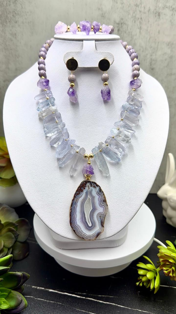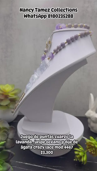 Juego de puntas cuarzo la lavanda, jaspe oceano y dije de agata crazy lace